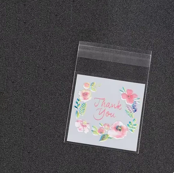 Biely darčekový sáčok, ktorý je lepiaci s potlačou "Thank you".