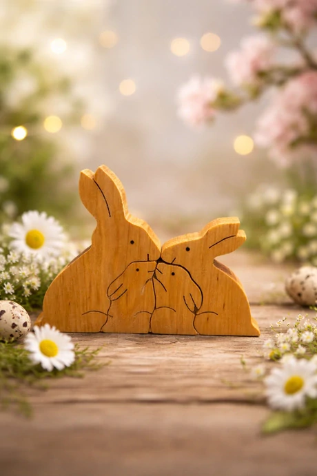 Ručne vyrezávaná veľkonočná rodinka zajačikov.