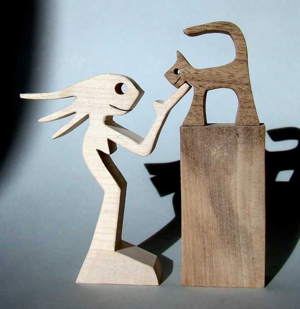 Ručne vyrezávané postavičky ženy a vždy prítulnej mačičky.